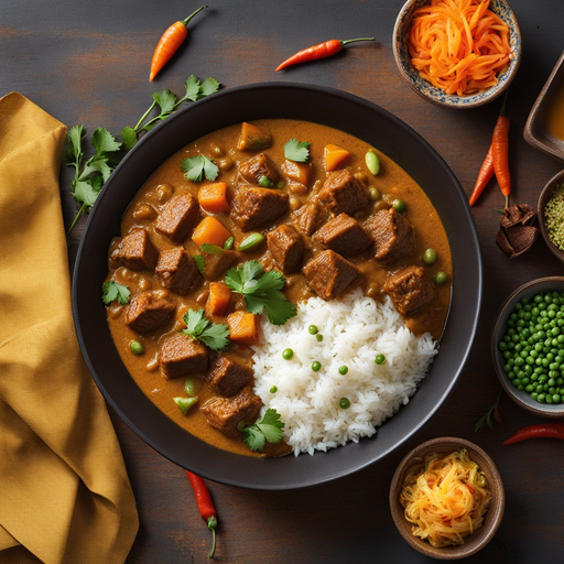 Um caril de carne substancial e saboroso servido sobre arroz de grão longo fofo, repleto de legumes e especiarias aromáticas.
