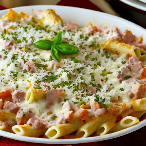 Um prato principal robusto com macarrão assado, presunto e molho Alfredo cremoso.