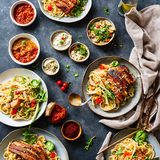 Um prato delicioso e saboroso, apresentando um suculento lombo de porco temperado com especiarias cajun, servido com macarrão teriyaki.