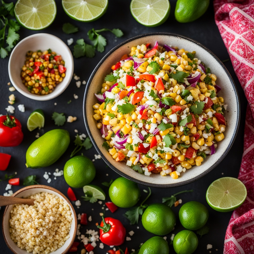 2. Em uma tigela, misture 4 xícaras de grãos de milho, 1 pimentão vermelho picado, 1 cebola roxa picada, 1/4 xícara de azeite, 2 colheres de sopa de suco de limão, 1 colher de chá de pimenta chili, sal e pimenta