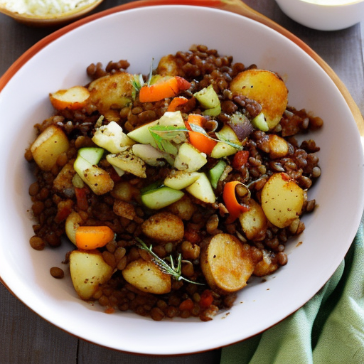 Um prato delicioso feito com batatas, lentilhas e legumes, realçado com amaretto.