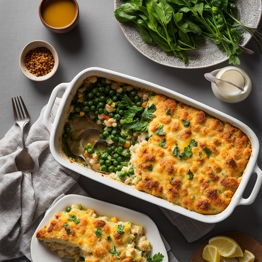 Um casserole reconfortante recheado com molho alfredo cremoso, frango macio e uma variedade de legumes, coberto com uma crosta crocante de ervas.