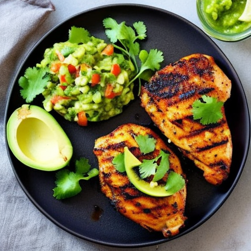 5. Enquanto o frango está grelhando, prepare a salsa de abacate. Em uma tigela separada, amasse o abacate com o suco de 1 limão. Adicione jalapeno picado, coentro picado, sal e pimenta a gosto.