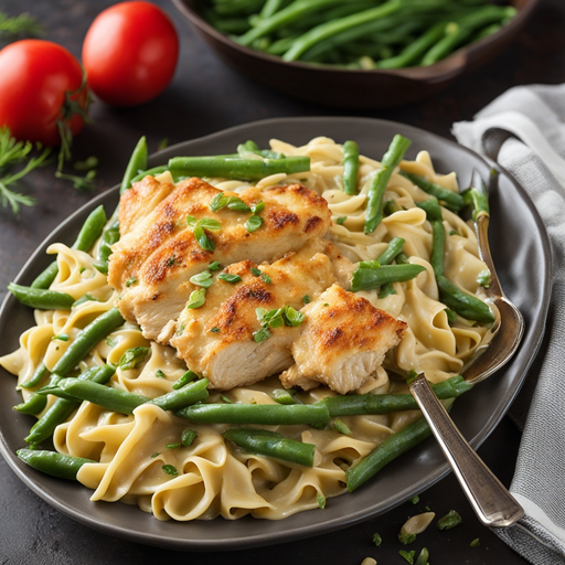 Um casserole reconfortante com frango macio, feijão verde e um molho cremoso, perfeito para um jantar em família aconchegante.