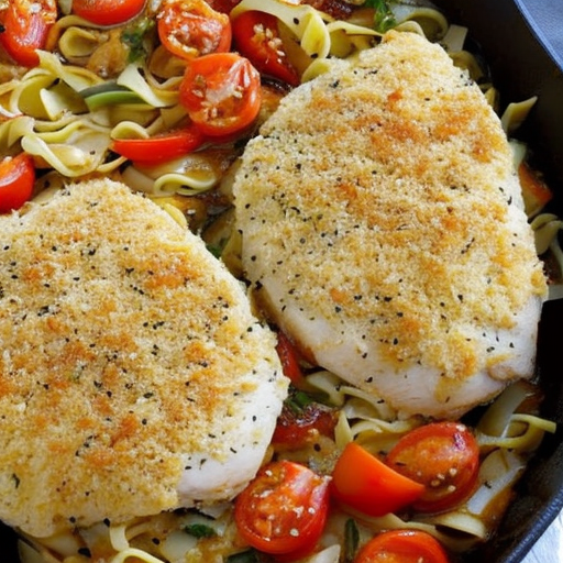 Um delicioso prato de frango assado com legumes e macarrão.