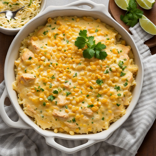 Um prato reconfortante com frango macio, milho doce e molho cremoso coberto com queijo cheddar derretido.