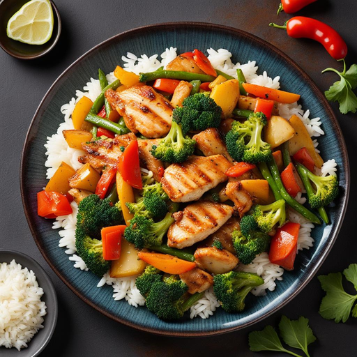 Um prato de salteado delicioso e nutritivo com frango macio, arroz de jasmim e uma mistura de legumes frescos.